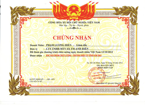 On 05.10.2012 is integration Business Association and awarded “Product quality reputable brand 2012” anniversary date 10.13.2012 Entrepreneur Vietnam.