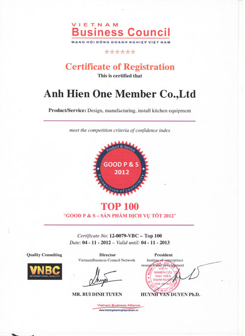 On 25.04.2012, the Standards and Consumer Protection Vietnam (VINASTAS), Consumer Magazine (The Consumer), the Council preferred brand (south) has officially granted certificates ANH HIEN TRADING PRODUCTION COMPANY LIMITED is currently board members preferred brand (south). This event is a brilliant successes marked achievements over 10 years of operation in Vietnam’s stainless steel sector company by Pham Luong Hien, director.