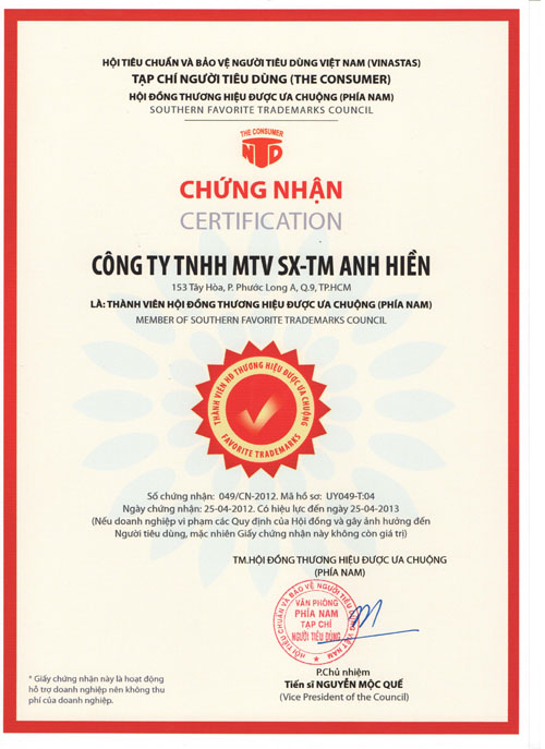 On 25.04.2012, the Standards and Consumer Protection Vietnam (VINASTAS), Consumer Magazine (The Consumer), the Council preferred brand (south) has officially granted certificates ANH HIEN TRADING PRODUCTION COMPANY LIMITED is currently board members preferred brand (south). This event is a brilliant successes marked achievements over 10 years of operation in Vietnam’s stainless steel sector company by Pham Luong Hien, director.